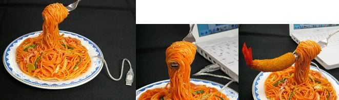 A company called Solid Alliance has come out with a series of unique USB gadgets. First is the a plate of spaghetti that is actually a USB extension cable. And if you own a USB Shrimp Drive, you can place it on the fork in order to connect to your computer.